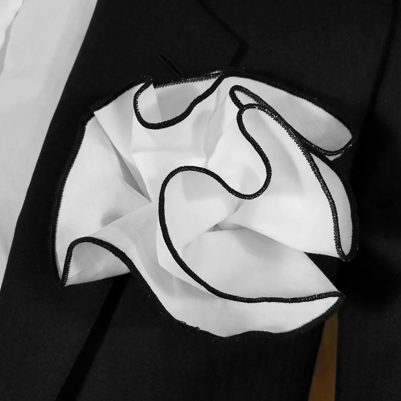 100% Cotton White 2-in-1 Pouf Round Pocket Square With Black Trim