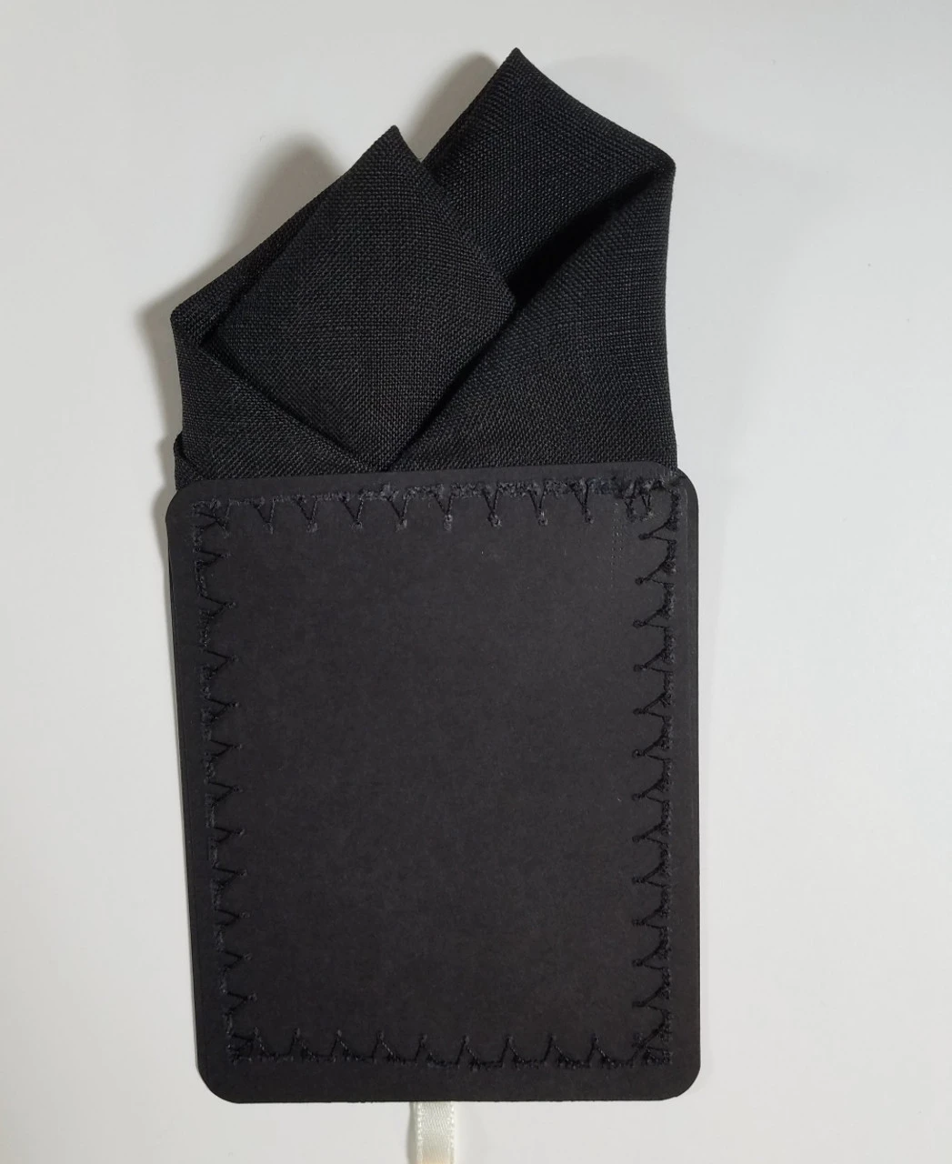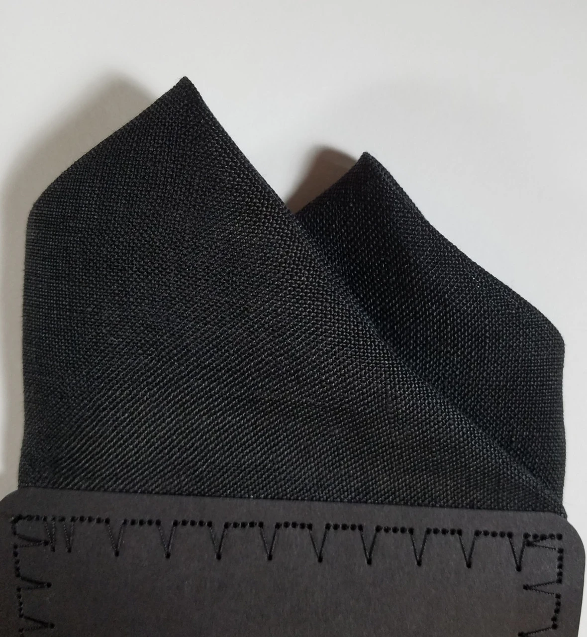 Dress up your suit or sport coat with a pre-folded pocket square. It’s easy to use and looks like a well placed pocket square. Just slip the insert into your breast pocket and adjust height to your taste. Trim bottom of card if you want less pocket square showing.