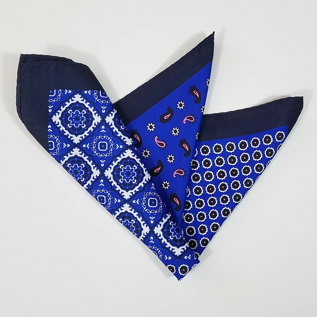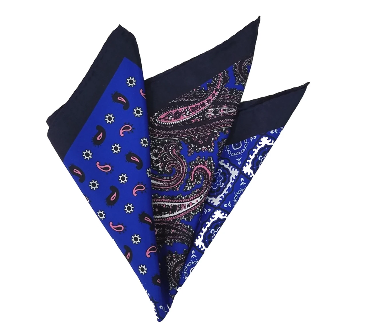 100% Silk Pocket Square – Navy & Pink Paisley & Royal Blue Medallion Design 12.5 X 12.5