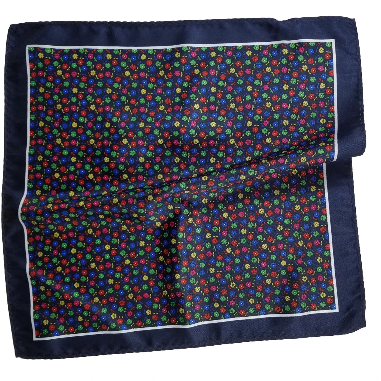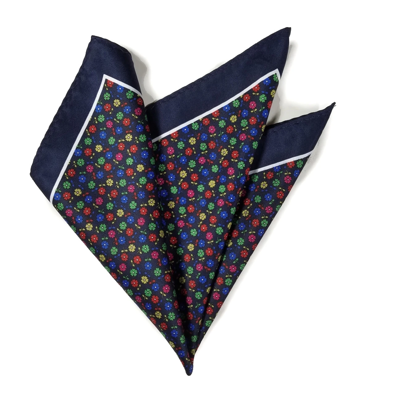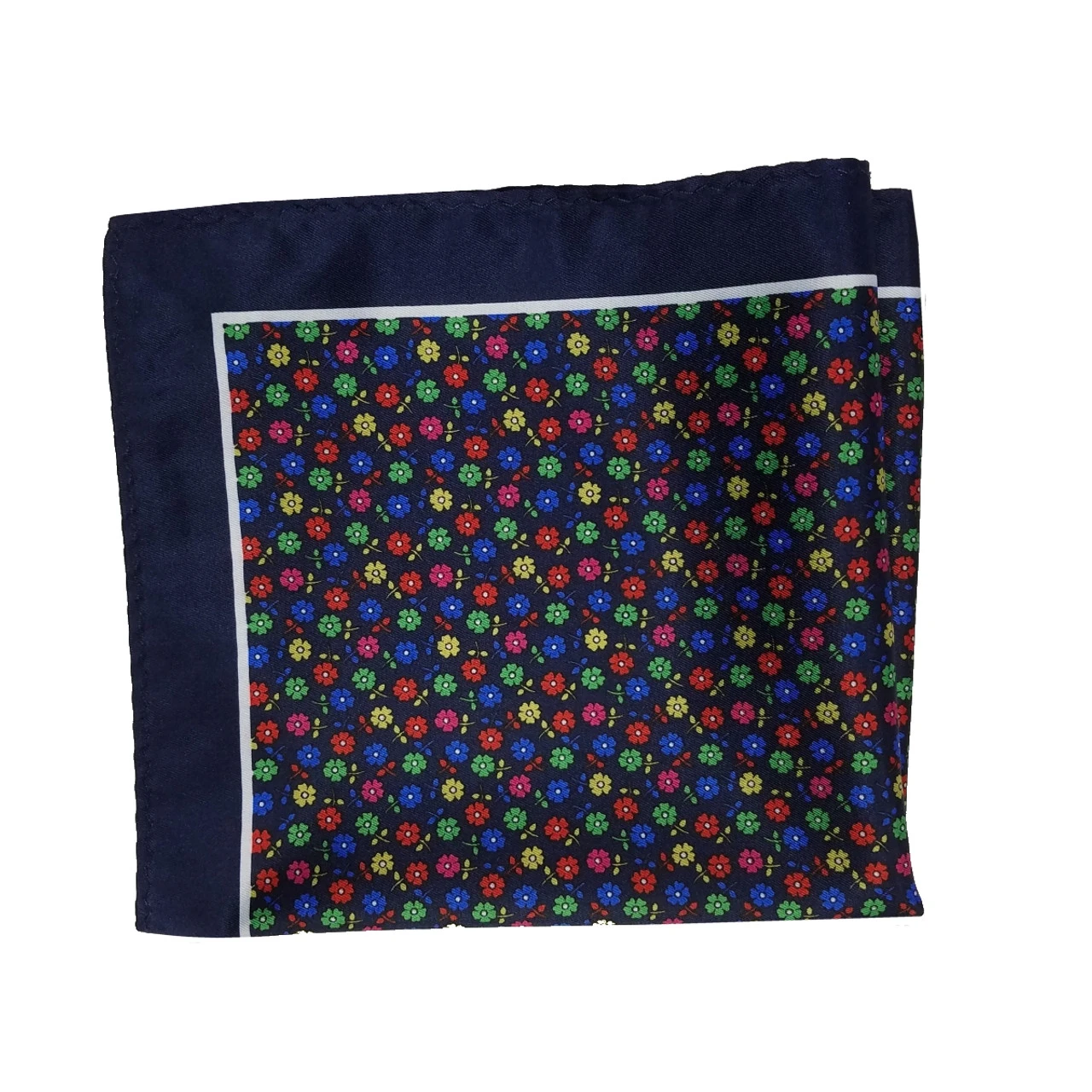 100% Silk Pocket Square – Navy With Petite Multi-Colored Flowers 12.5in