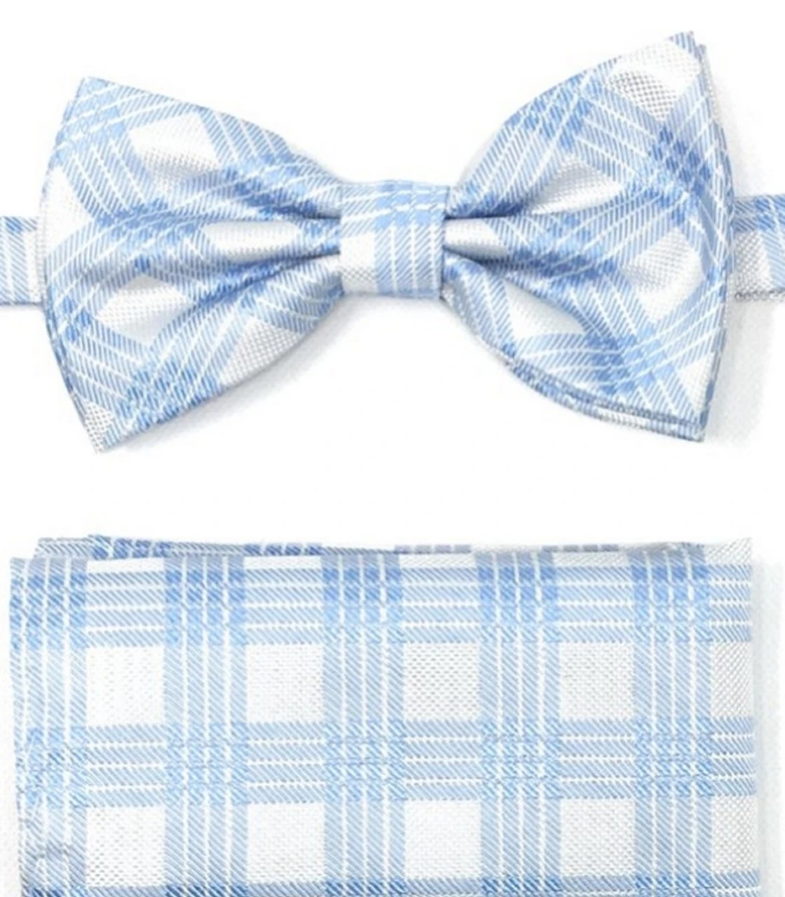 Light Blue & White Plaid Pre-Tied Silk Bow Tie Set