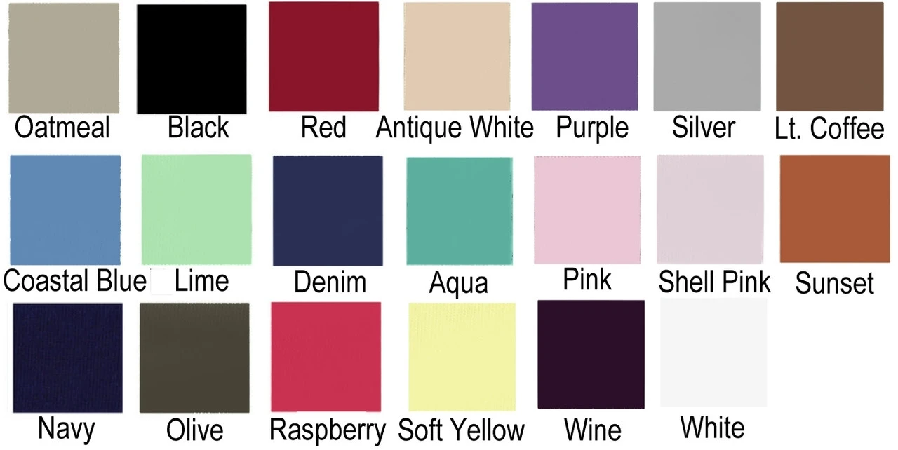 | Color Required | Antique White, Aqua, Black, Coastal Blue, Denim Blue, Lt. Coffee, Navy, New Lime, Oatmeal, Olive, Pink, Purple, Raspberry, Red, Shell Pink, Silver, Soft Yellow, Sunset, Wine, White |
