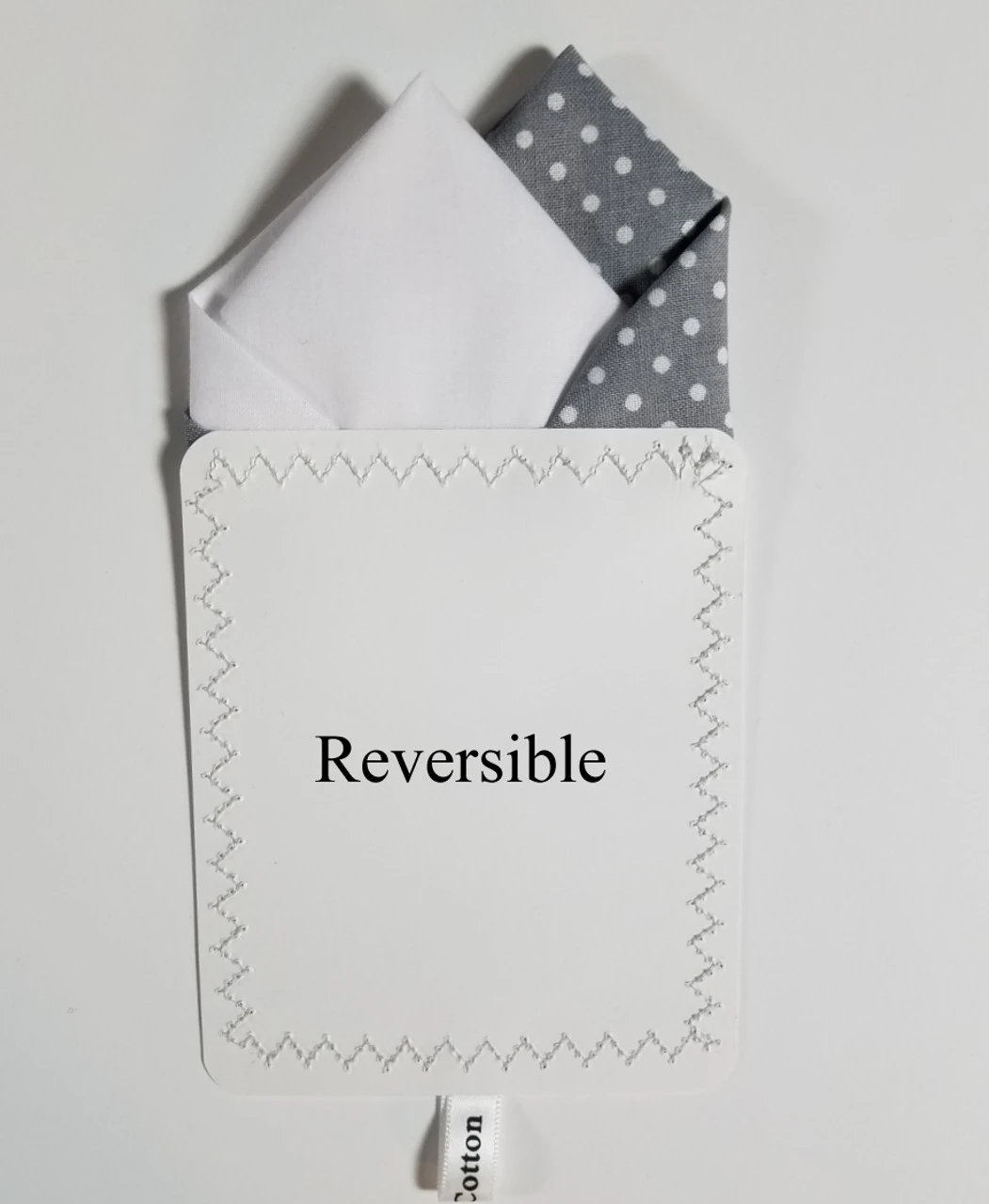 Dress up your suit or sport coat with a pre-folded pocket square. It’s easy to use and looks like a well placed pocket square. Just slip the insert into your breast pocket and adjust height to your taste. Trim bottom of card if you want less pocket square showing.