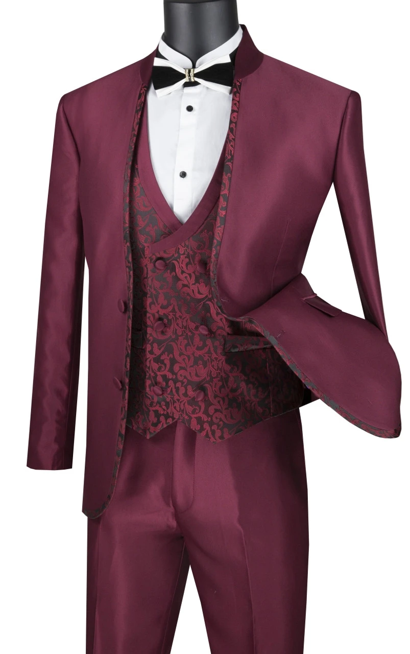 Vinci 3 Piece Collar-less Floral Pattern Vested Fancy Suit – Burgundy