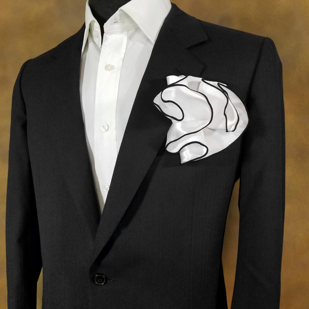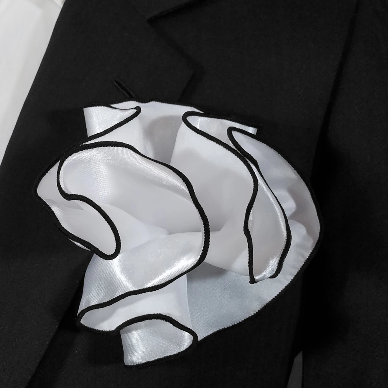 White Satin 2-in-1 Pouf Round Pocket Square With Black Trim